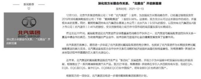 12月13日,北汽集团宣布,为加强双方长期战略合作,已经通过继续投资在2019年持有戴姆勒股份公司9.98%股份。