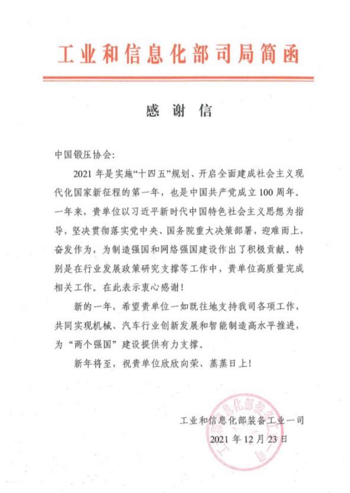 岁末年初,当人们沉浸在迎接新年的喜庆氛围中时,中国锻压协会也喜事连连,喜获一封来自国家工业和信息化部装备工业一司的感谢信,信中对中国锻压协会为制造强国和网络强国建设作出的积极贡献给予了高度评价和肯定。