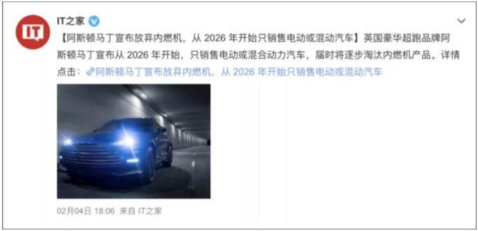又一家车企宣布未来将成为电动汽车品牌。据外媒报道,英国豪华超跑品牌阿斯顿马丁宣布从2026年开始,只销售电动或混合动力汽车,届时将逐步淘汰内燃机产品。