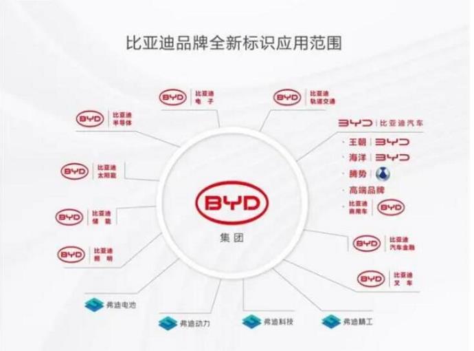 比亚迪集团新标识,将在旗下电子、新能源、轨道交通以及汽车产业中使用,与此同时,汽车产业的乘用车板块各品牌将使用各自的品牌标识。