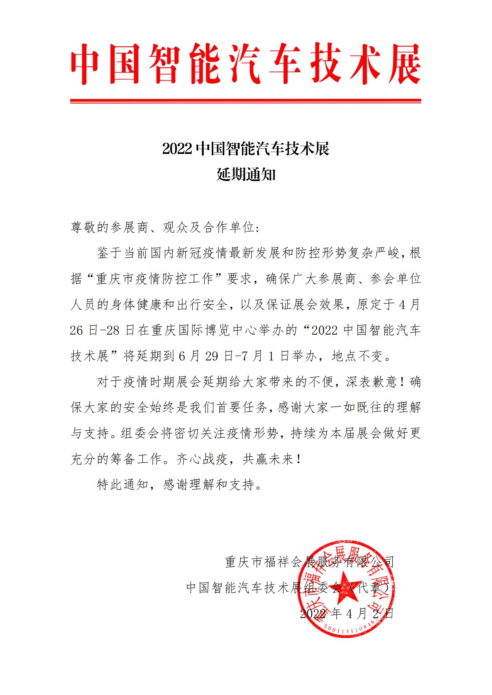 鉴于当前国内新冠疫情最新发展和防控形势复杂严峻,根据“重庆市疫情防控工作”要求,确保广大参展商、参会单位人员的身体健康和出行安全,以及保证展会效果,原定于4月26日-28日在重庆国际博览中心举办的“2022中国智能汽车技术展”将延期到6月29日-7月1日举办,地点不变。