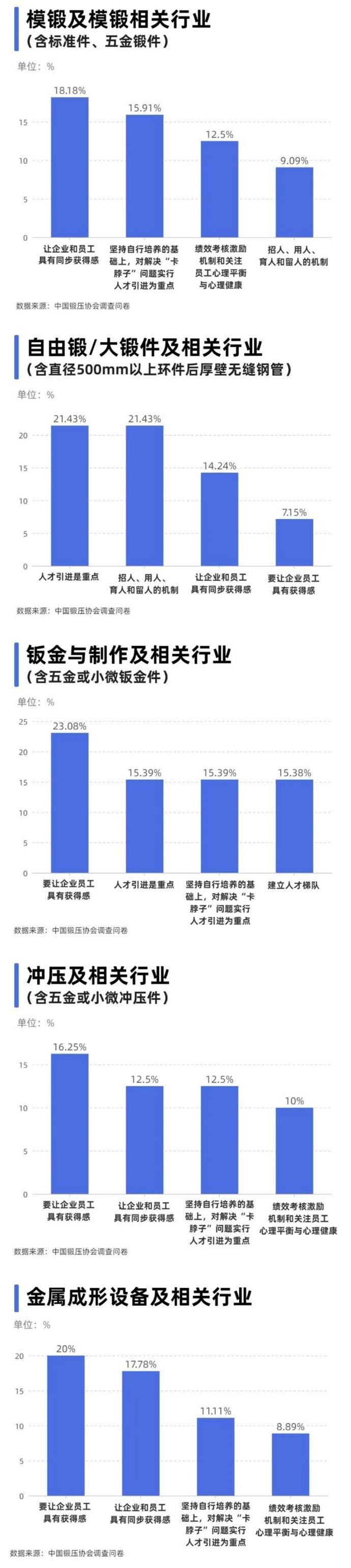 2021年11月开始,中国锻压协会通过网络开展了问卷调查,设置了多个调研主题,目的是更好地引导企业了解行业发展态势,为行业企业提供精准服务。本文是第六个主题调查结果汇总分析。本处是对调查题目“人才战略”进行整理,列出了位于前列的大家最为关注的内容,统计分析结果如下: