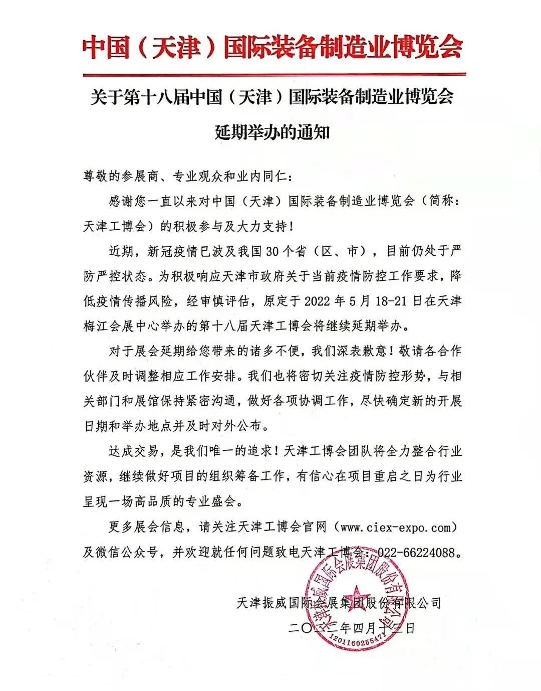 感谢您一直以来对中国(天津)国际装备制造业博览会(简称:天津工博会)的积极参与及大力支持! 近期,新冠疫情已波及我国30个省(区、市),目前仍处于严防严控状态。为积极响应天津市政府关于当前疫情防控工作要求,降低疫情传播风险,经审慎评估,原定于2022年5月18-21日在天津梅江会展中心举办的第十八届天津工博会将继续延期举办。具体时间另行通知。