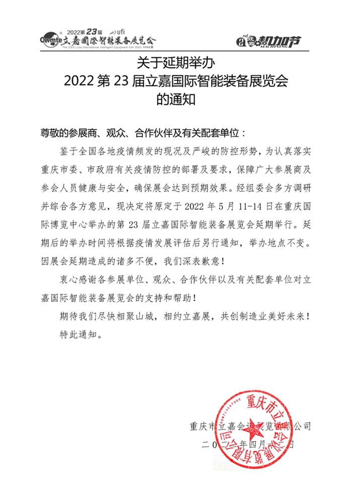 关于延期举办2022 第23 届立嘉国际智能装备展览会的通知