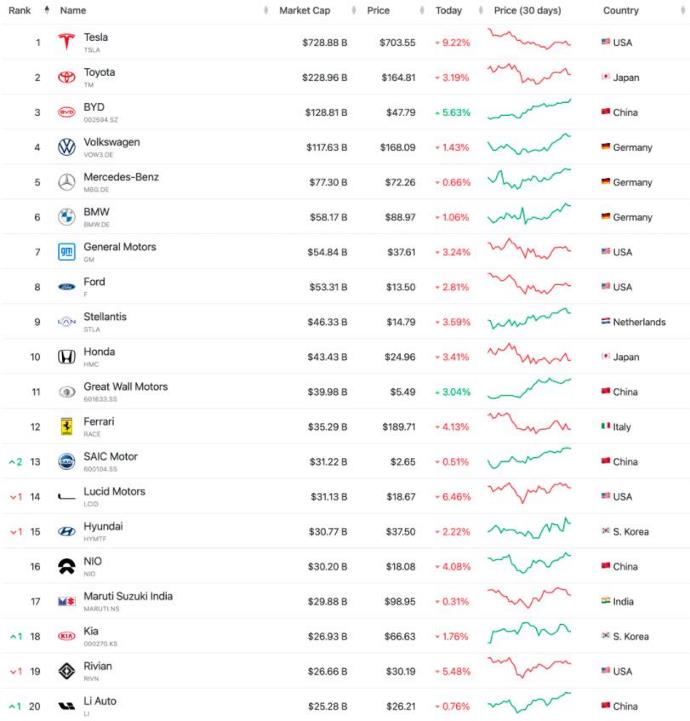 据最新全球车企市值排行榜显示,特斯拉仍是全球市值第一车企,以7289.8亿美元遥遥领先其它车企。