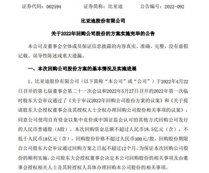 6月14日晚间,比亚迪发布《关于2022年回购公司股份的方案实施完毕的公告》。