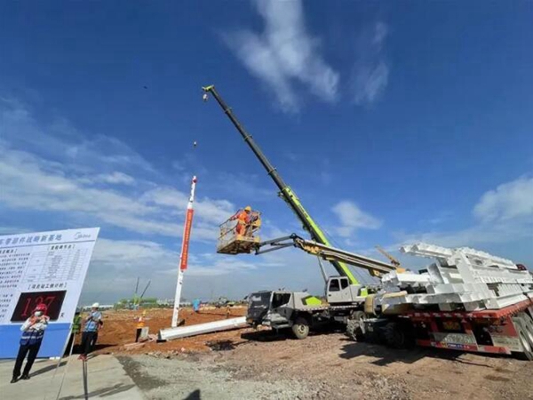 7月5日上午,安庆美的新能源汽车零部件战略新基地(一期)项目钢结构首吊,标志着项目从基础施工正式步入钢结构吊装阶段。