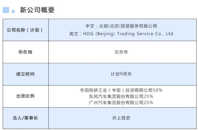 合资公司定名为众锐(北京)贸易服务有限公司,英文名HDG (Beijing) Trading Service Co., Ltd,合资公司所在地位于北京市。具体来看,合资公司本田中国、东风汽车集团、广汽集团三方出资比例分布为50%、25%和25%,公司法人和董事长均为本田技研工业株式会社常务执行董事兼中国本部长、本田技研工业(中国)投资有限公司总经理、本田技研科技(中国)有限公司总经理井上胜史。