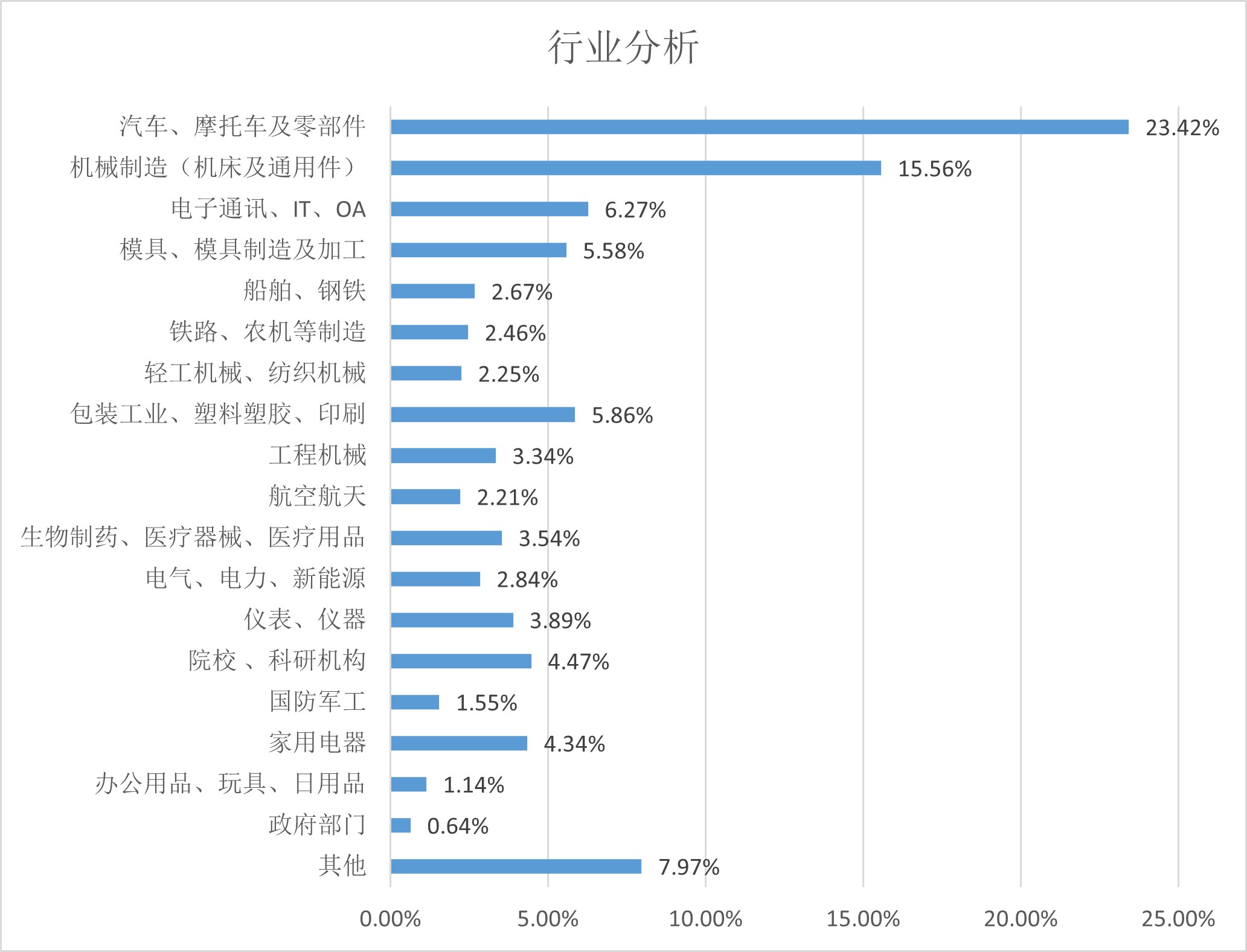 参观展会的企业行业,以汽车、摩托车及零部件企业最多,占到总数的23.42%,其次为机械制造(机床及通用件),占15.56%。此外,电子通讯、模具、船舶、钢铁、铁路、农机、轻工、橡塑包装、工程机械、国防军工、航空航天、生物医药、家电等制造行业均有涉及。