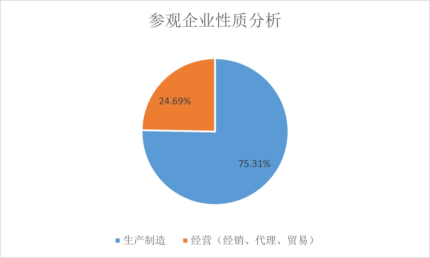 据展会组委会统计,本次展会参观企业达6341家,从企业性质总数量占比来看,生产制造企业占75.31%,经营(经销、代理、贸易)企业占24.69%,两者合计占100%。由此可以看出,在参观企业中,以生产制造企业为主,占比较大。