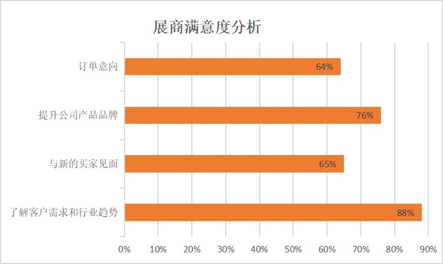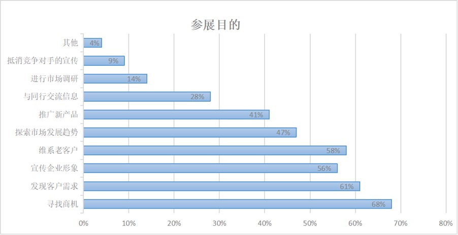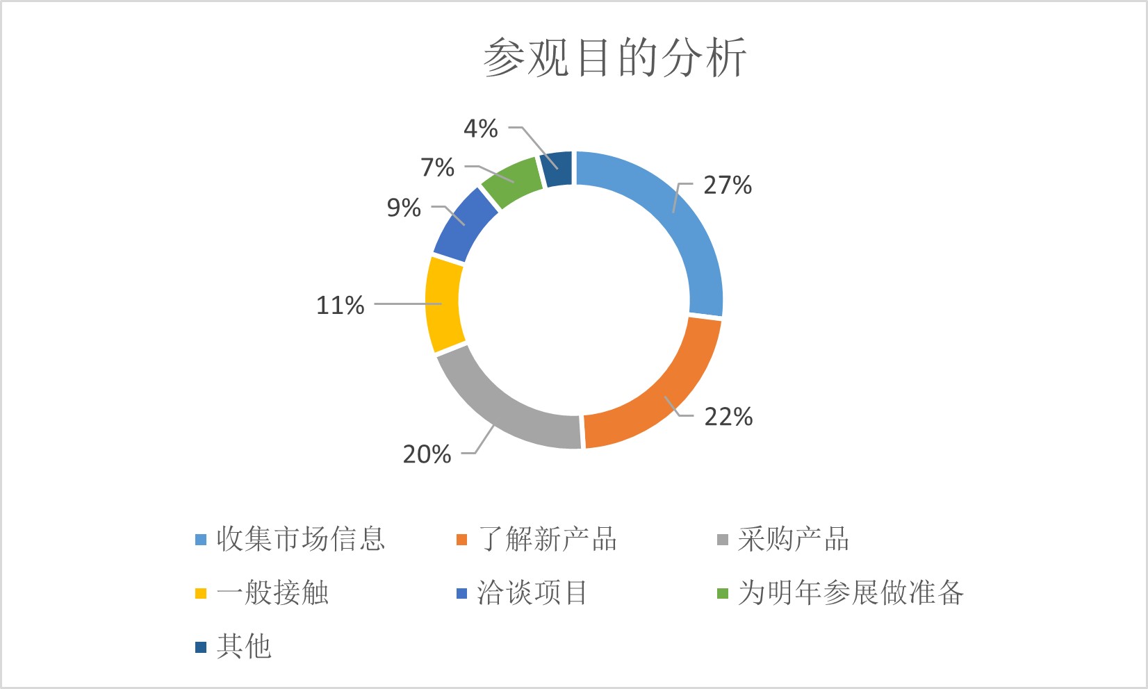 专业观众的参观目的有“收集市场信息”“了解新产品”“采购产品” “一般接触”“洽谈项目”“为明年参展做准备”,比重依次降低。