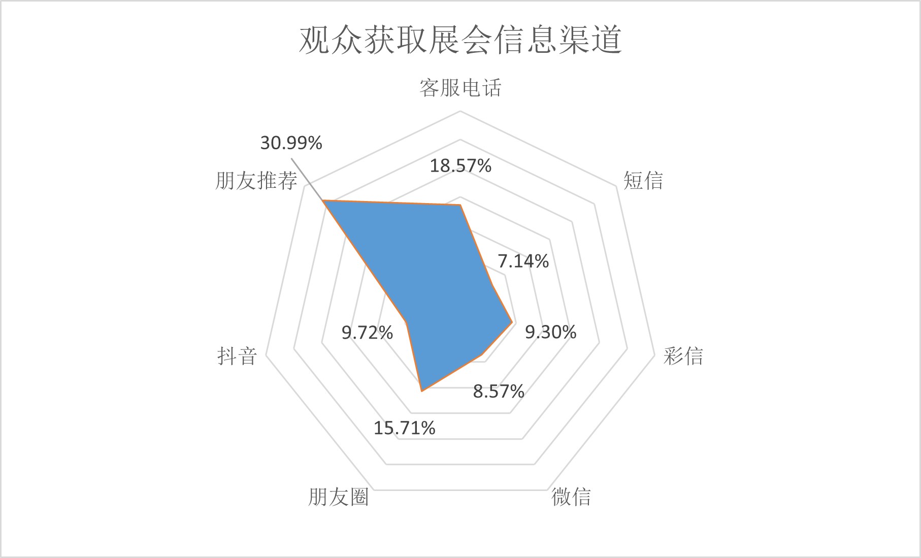 经由微信(朋友圈、公众号、微信群)、同行好友、打电话告知前来参观的观众人数最多;其次为传统纸媒、装备嘉族;抖音、短信、微博、电视、广播渠道也有效触及了行业人士。