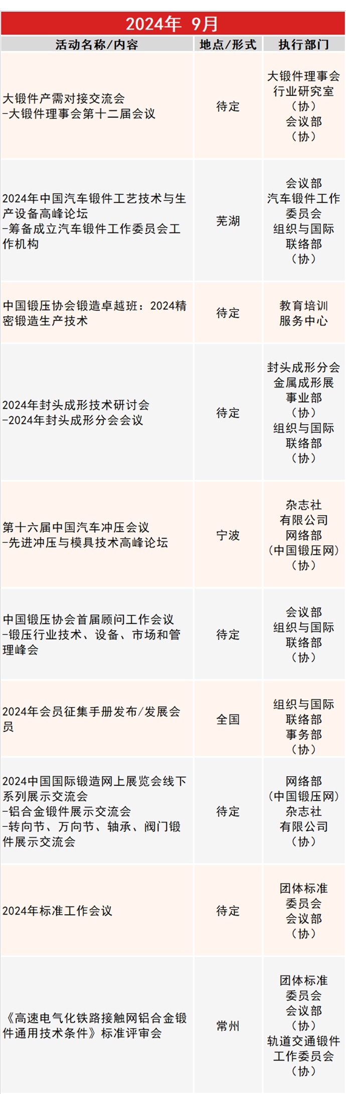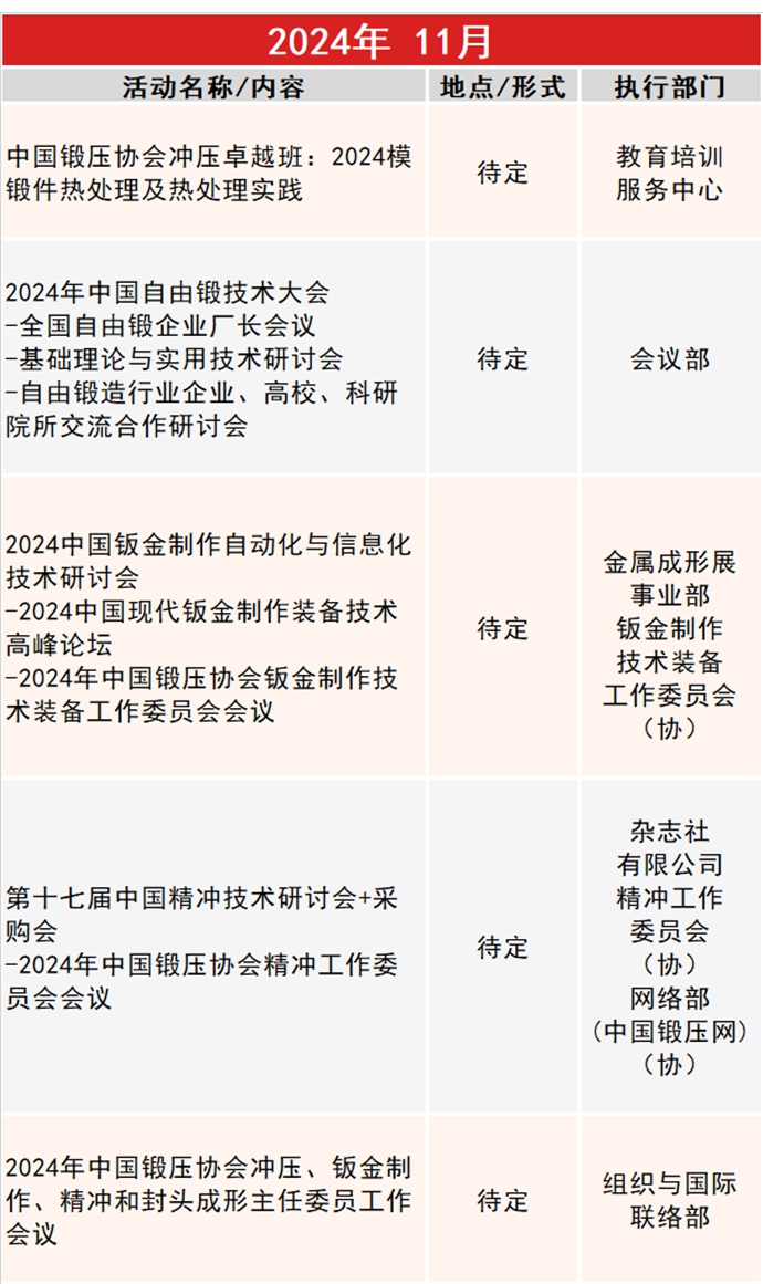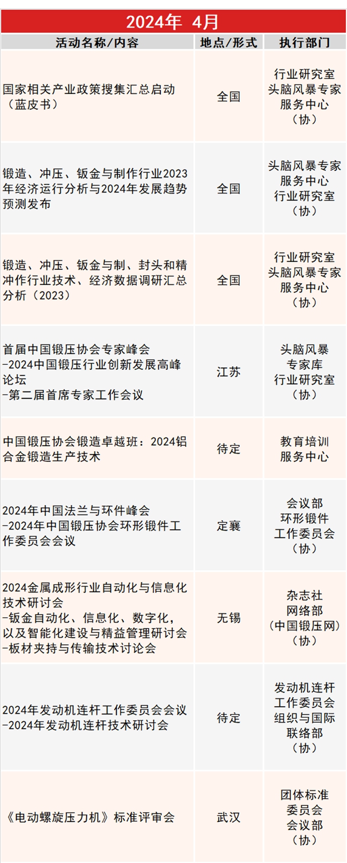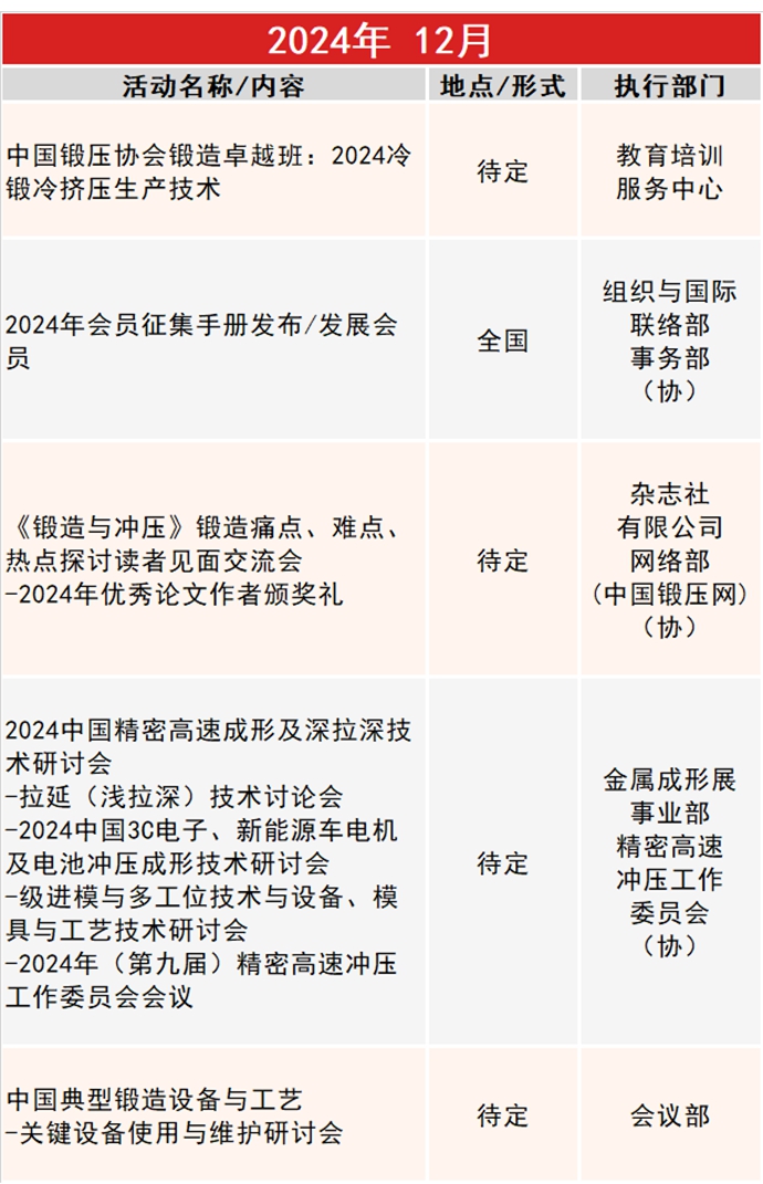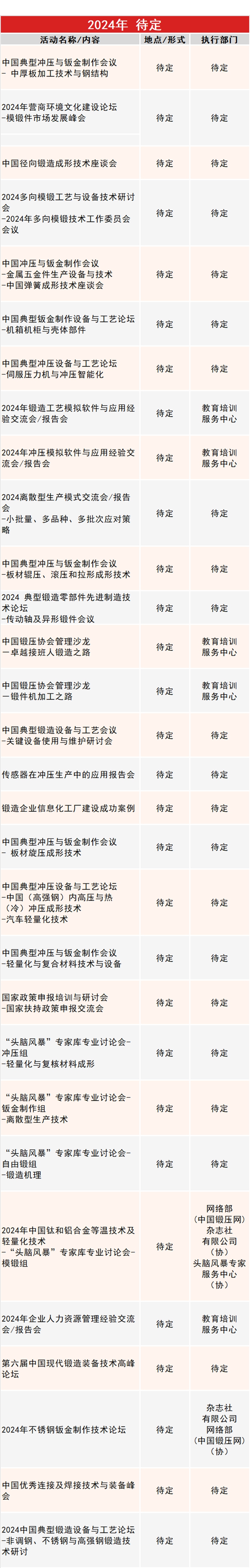 本活动计划附有英文版。活动计划将根据行业工作需要进行时间、地点和内容的调整,也会有新的活动出台,请关注中国锻压协会官网http://www.chinaforge.org.cn 和中国锻压协会会议中心http://www.sinoforging.com信息。有任何问题,请联系: