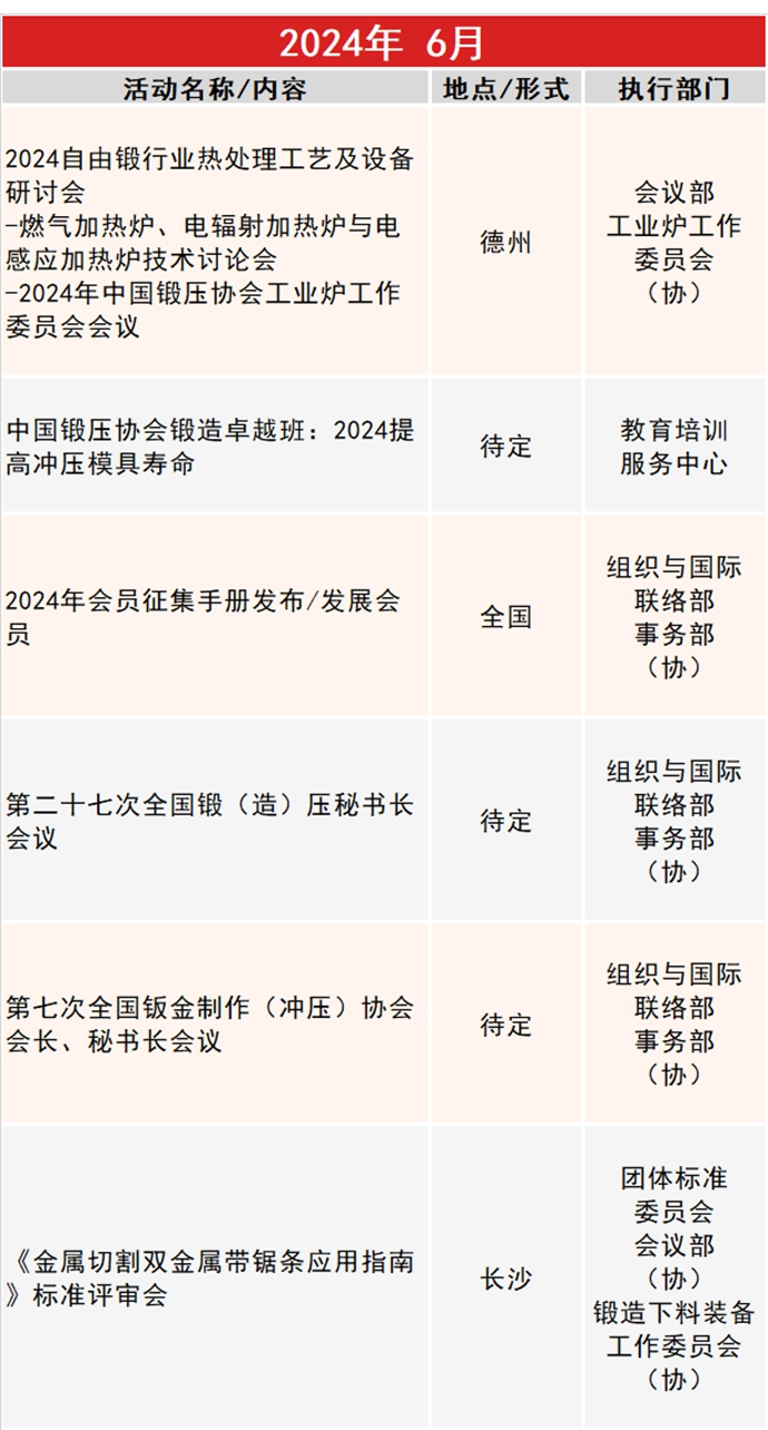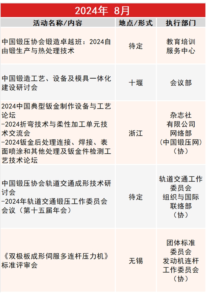 (协)=协助之意;富京公司=北京富京技术公司;杂志社有限公司=《锻造与冲压》杂志社有限公司;地方协会=与中国锻压协会建立了联络关系的地方锻造、冲压和钣金制作行业协会;多部门并列一起表示共同组织。中国锻压协会按专业和行业设立有19个分会和工作委员会,一些活动明确了由分会或相应工作委员会承办。对涉及其他分会或工作委员会专业内容的活动,该分会或工作委员会即成为活动的主办方或协办方,但活动表中没有列出这些分会或工作委员会名称,以活动通知为准。