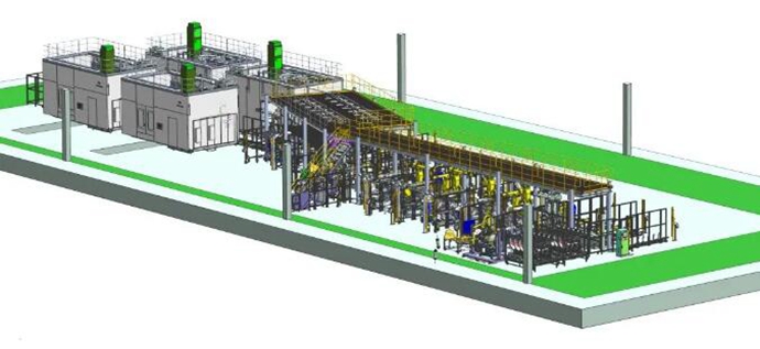 压铸零件自动加工及装配生产线由4台压铸车身双五轴龙门加工中心、9台六轴机器人与视觉引导系统等组成,可完成铝合金零件的全自动加工和23个工位的全自动压铆、拉铆、钢丝螺套等复杂生产工艺。双五轴龙门加工中心的最大快移速度达到120m/min,进给轴最大加速度可达13m/s²,整线生产节拍达到28JPH。配置有视觉检测等先进技术,可实现零件的在线质检与质量追溯。