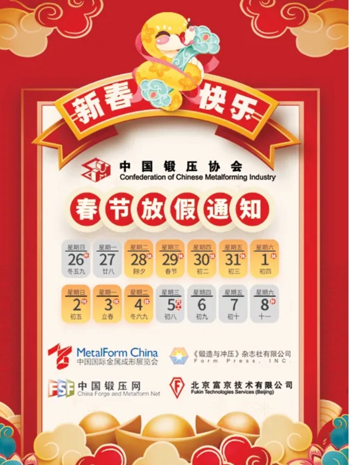 中国锻压协会秘书处放假安排1月28日-2月4日放假。