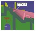 ⑴两厢后盖外板上平面区域拉延较深,工艺凸包的存在会增大料片拉延伤碎的风险,工艺设计中上下模大平面区域应尽量避免工艺凸包的设置。工艺设置大平面区域包模芯拉延成形,有利于料片流动与受力均匀。