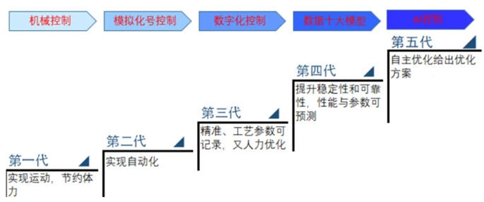 从设备控制角度分,锻压设备经历了三个发展阶段,目前正处于第四个阶段,也就是数据+大模型控制的第四代。第一代是机械控制,第二代是模拟信号控制,第三代是数控,未来应该进入第五代AI控制阶段,图示如下: