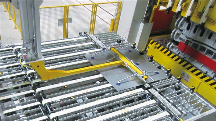 机械手冲压自动化生产线主要由机械手、拆垛台车、皮带输送机、清洗机、涂油机、机械对中系统、整线自动化控制系统、冲压同步功能软件、整线网络控制、柔性端拾器、整线安全防护系统、压机及模具、视频监控系统、LED显示系统、照明系统、检验台等设备组成。具有自动化程度高、效率高、安全稳定性好、适应多品种小批量柔性生产等优点。